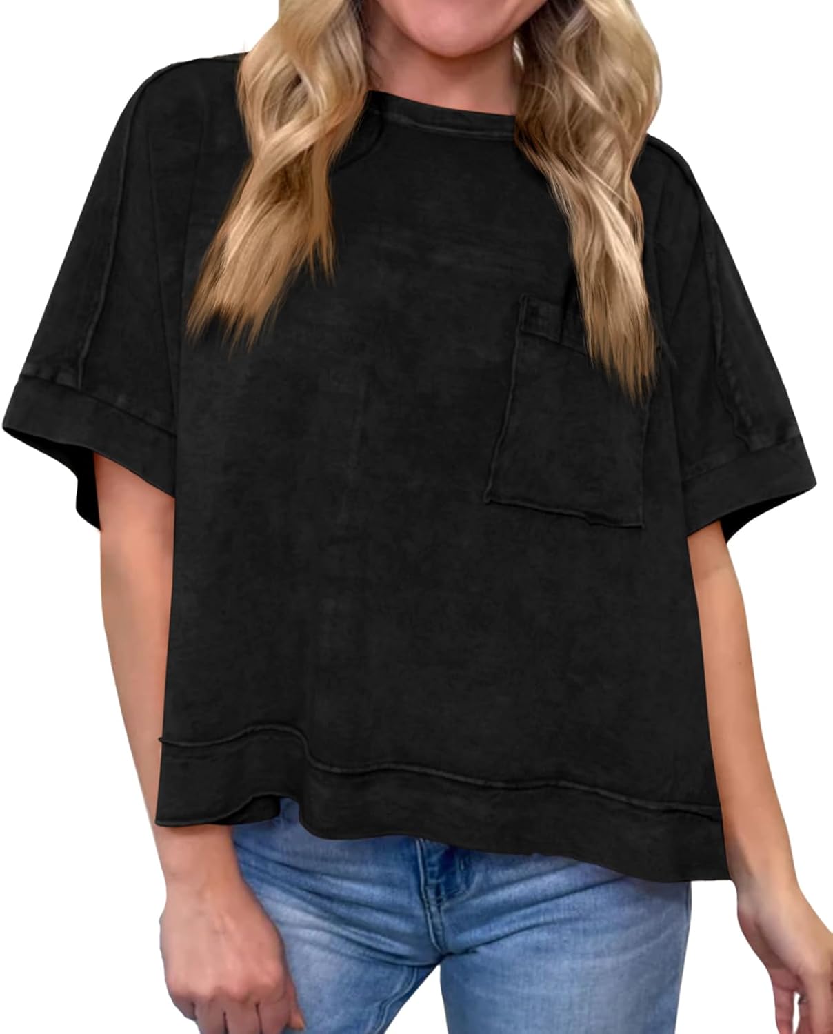 Cicy Bell Womens Summer Cropped T-Shirts Boxy Casual Short Sleeve Crew Neck Tops Acid Wash Cotton Loose Fit Tee Shirts