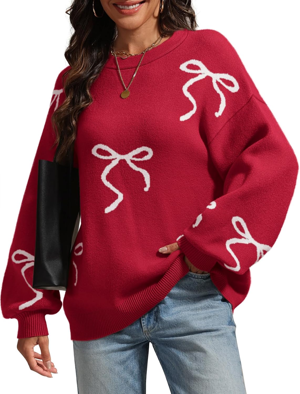 EHSUYAB Women Cute Christmas Bow Sweater Holiday, Crewneck Long Sleeve Knit Soft Cozy Sweater,Fall Winter Casual Date Outfit