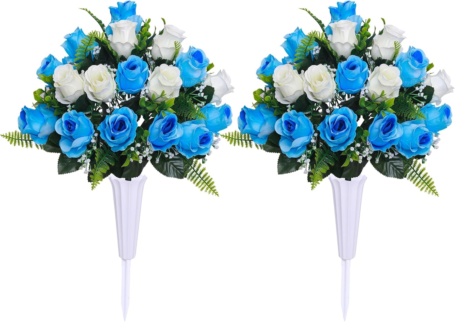 Set of 2 Artificial Cemetery Flowers with Vase,Grave Memorial Flowers,Artificial Rose Bouquet Decoration for Cemetery Headstones Gravesites (White & Blue, 2 Bouquets)