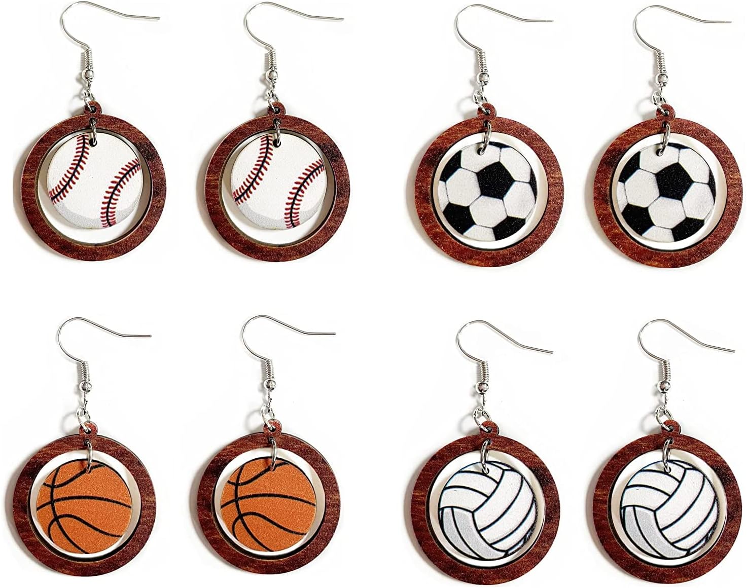 Retro Sports Ball Wooden Dangle Earrings Dainty Baseball Football Basketball Volleyball Print Wood Stud Earrings Set for Women Sports Fans Players Jewelry
