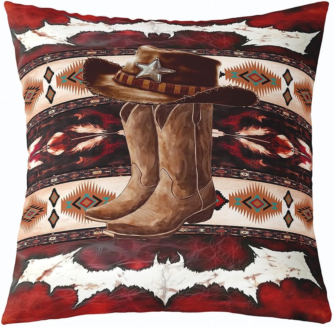 jejeloiu Cowboy Hat Boots Throw Pillow Covers 1 Pcs Cowhide Cow Print Retro Fur Decorative Pillowcase Western Cushion Covers Exotic Geometric Cushion Case Boho Rustic Farmhouse Home Decor 16 x 16-Inch