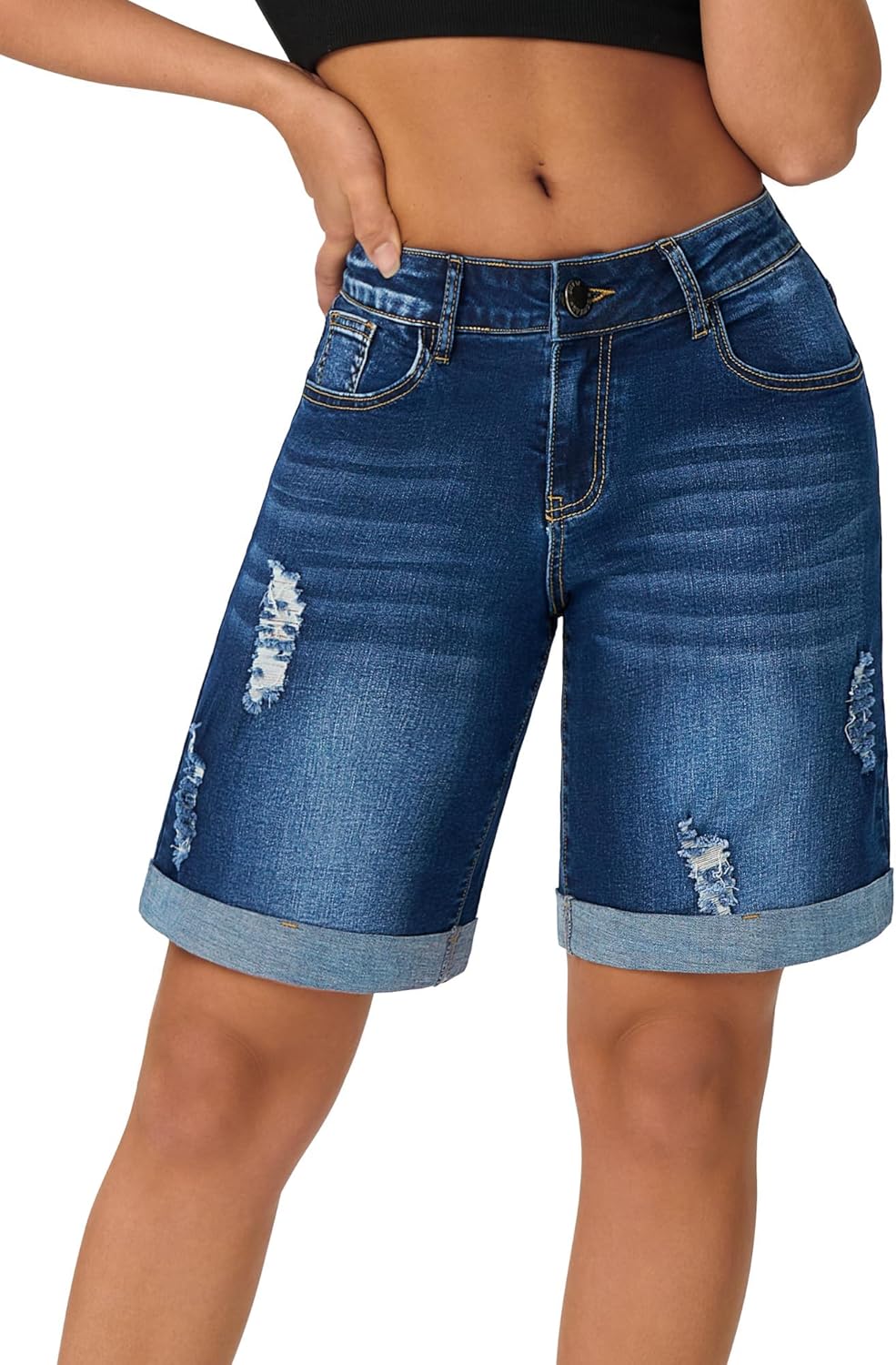 roswear Women’s Wide Leg Bermuda Shorts High Waisted Stretchy Distressed Baggy Denim Jean Shorts