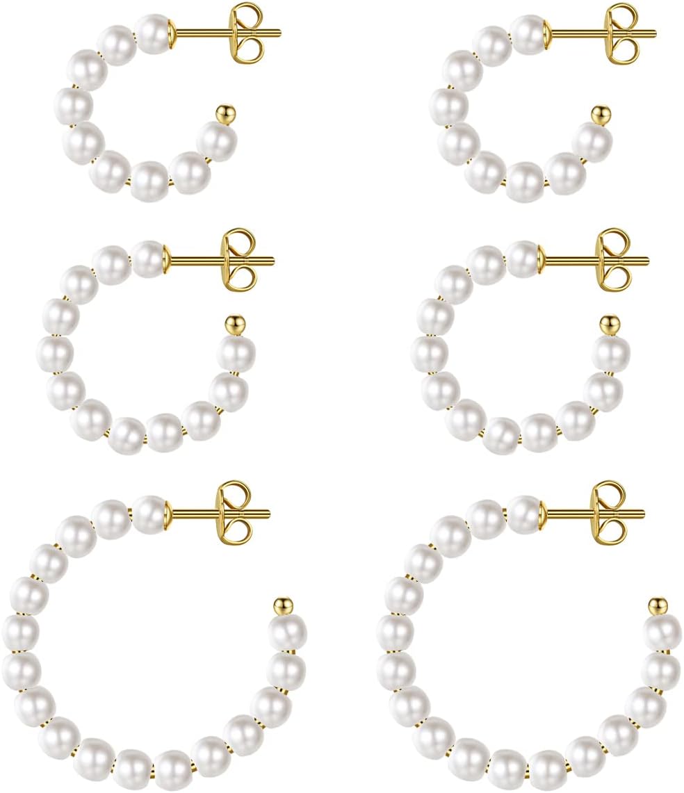 MUYAN 3 Pairs Pearl Hoop Earrings for Women,Gold Plated Pearl Earrings Lightweight Hoops White Pearl Jewelry