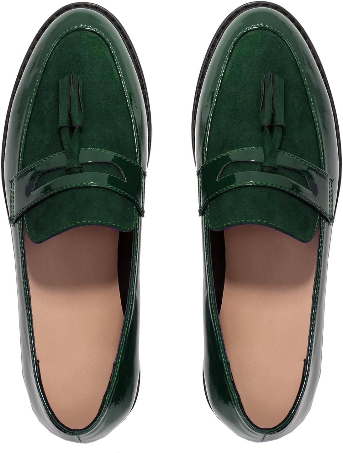 Women Low Chunky Heel Loafer Shoes Tassel Round Toe Slip On Dress Loafers Fringe 1" Block Low Heel Dress Loafers Patent Suede Penny Loafers Comfy Office Shoes Green 9.5 M US