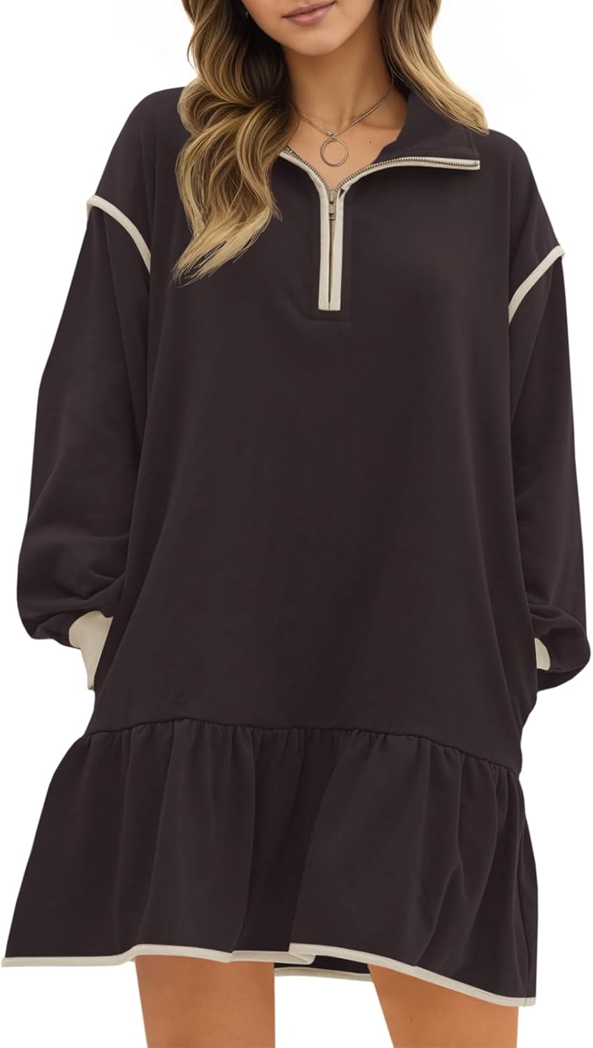 Wenrine Womens 2025 Fall Oversized Sweatshirt Dress Casual Long Sleeve Quarter Zip Ruffle Hem Pullover Mini Dresses