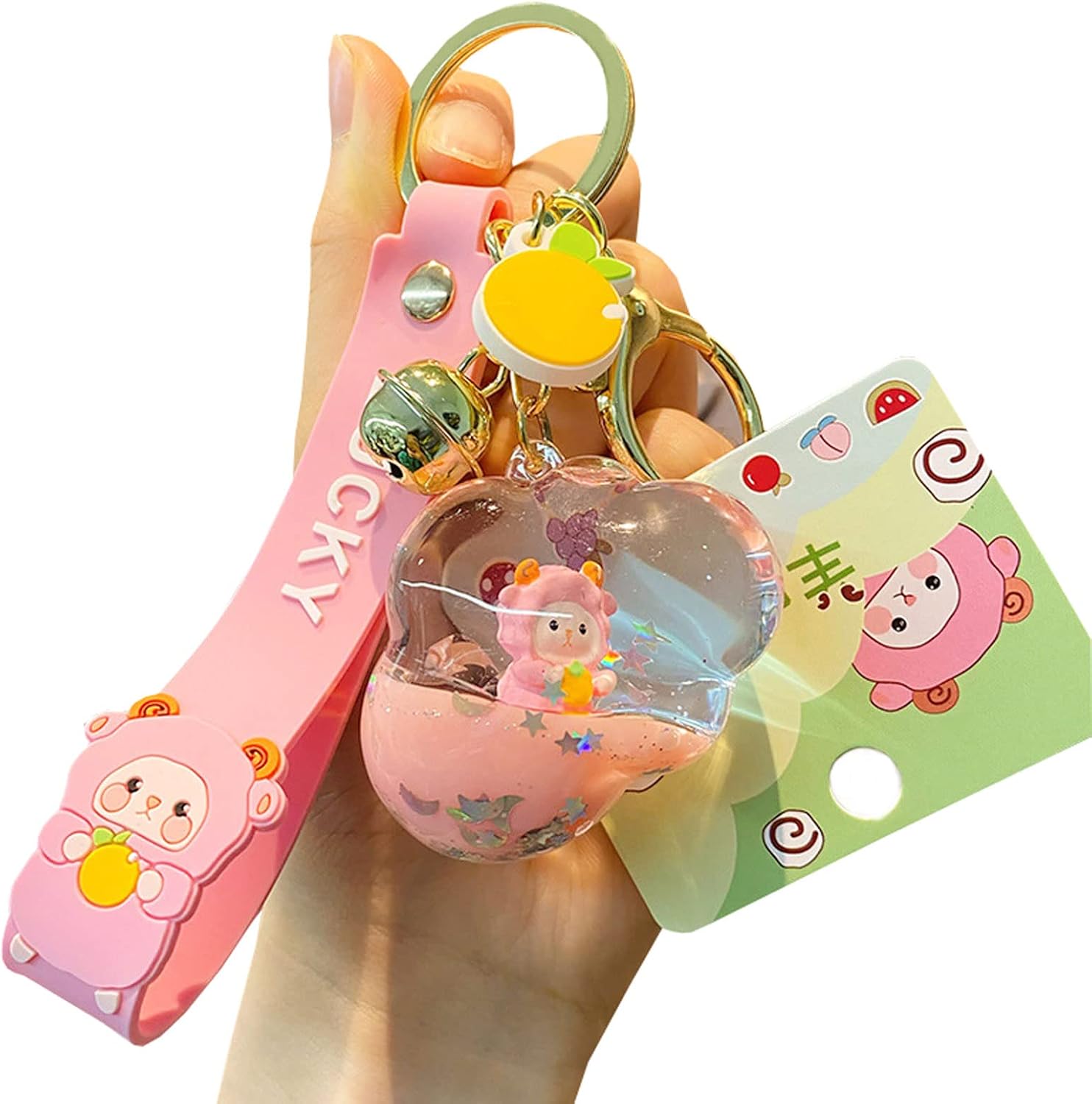 Cute Kawaii Floating Fruit Sheep Character Cloud Design Backpack Car Key Pendant Kids Girls Women Handbag Wallet Clear Acrylic Glitter Liquid Keychain Pink