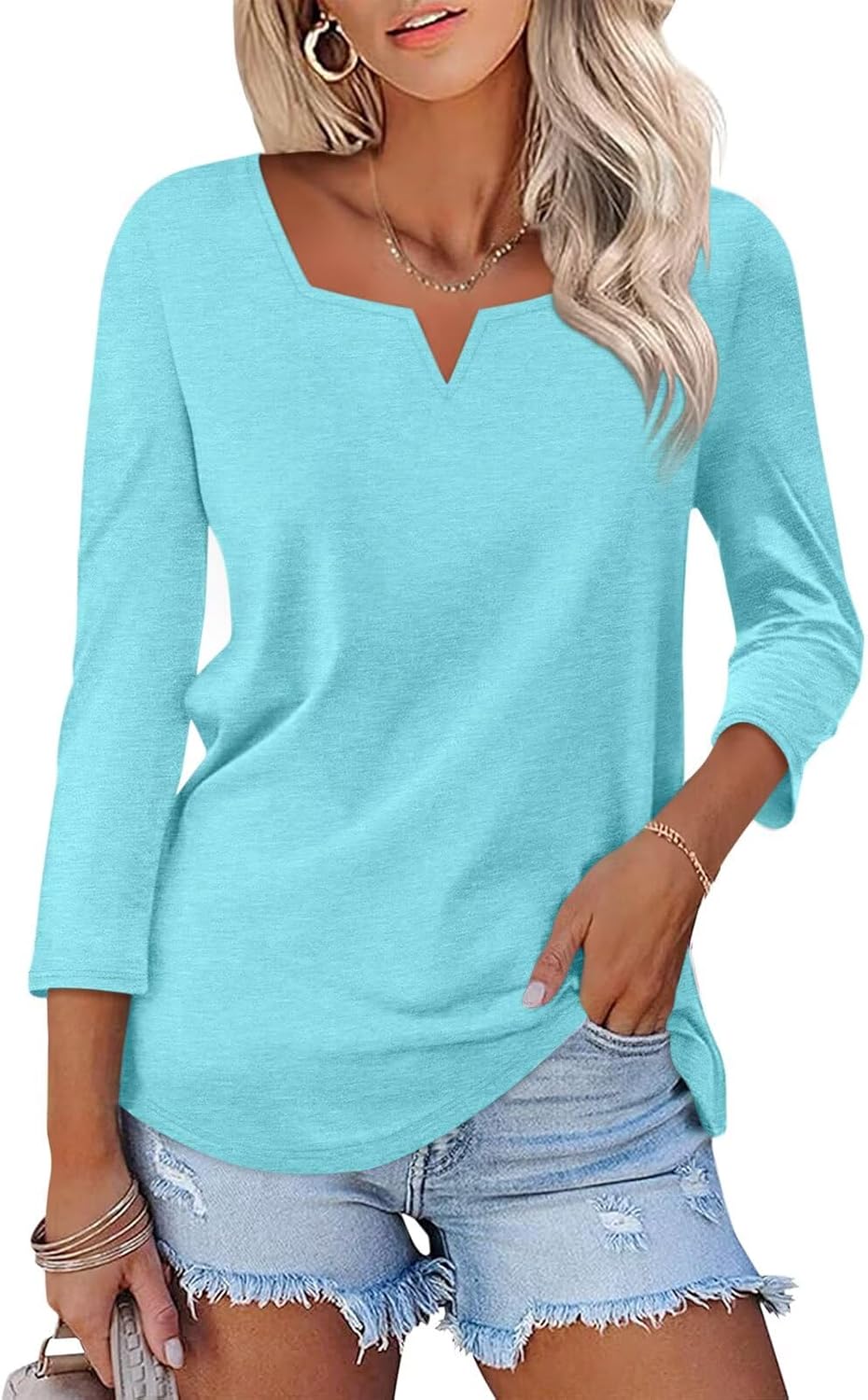 Women's 3/4 Length Sleeve Tops Square V Notched Neck Shirts Casual Summer Blouses
