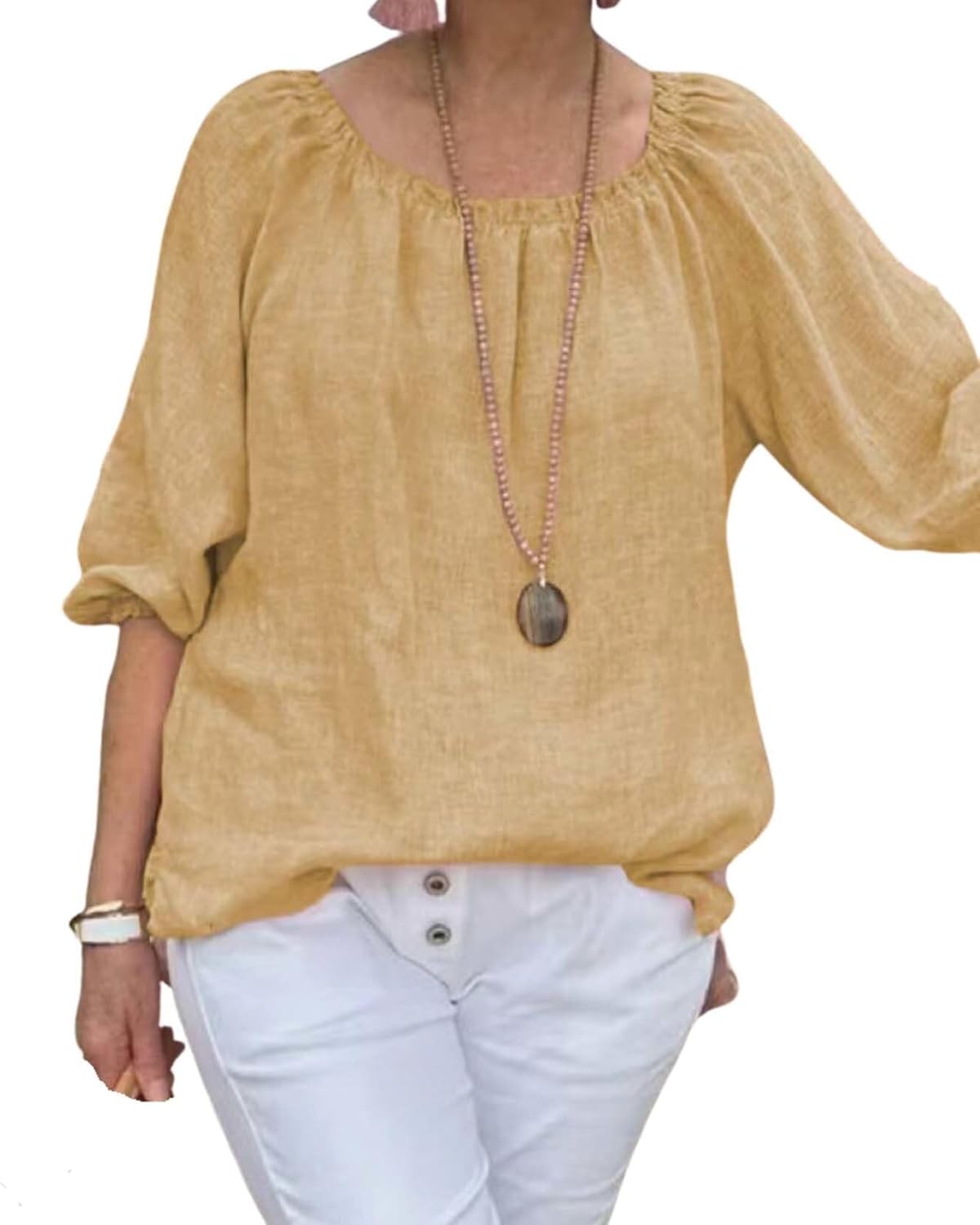 Summer Casual Womens Linen Shirt Round Neck Half Sleeve Linen Loose Pleated Tops Fashion Blouse T Shirt