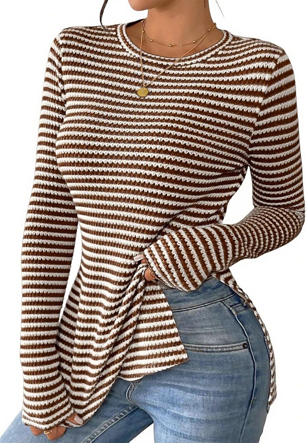Striped Long Sleeve Shirts Womens Trendy Crew Neck Slimming Tight Fit Side Slit Knit Tops to Wear with Leggings