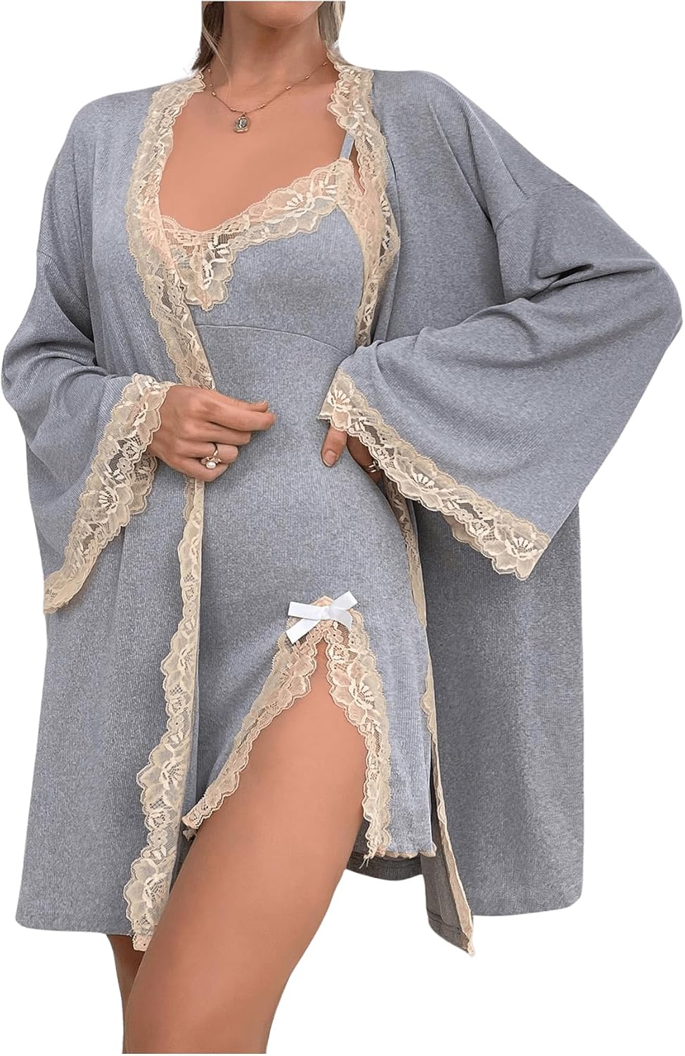 OYOANGLE Women's 2 Piece Robe Set Lace Trim Cami Nightgown and Long Sleeve Kimono Pajama Sets