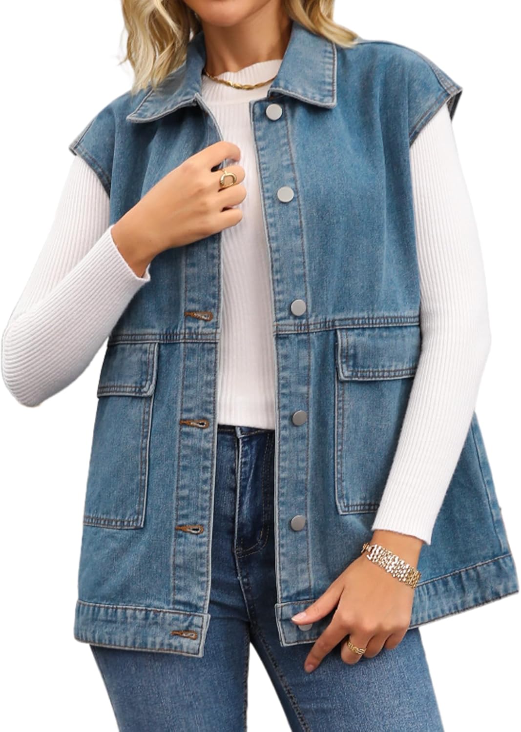 Womens Long Denim Vest Button Down Oversized Sleeveless Utility Jean Jacket
