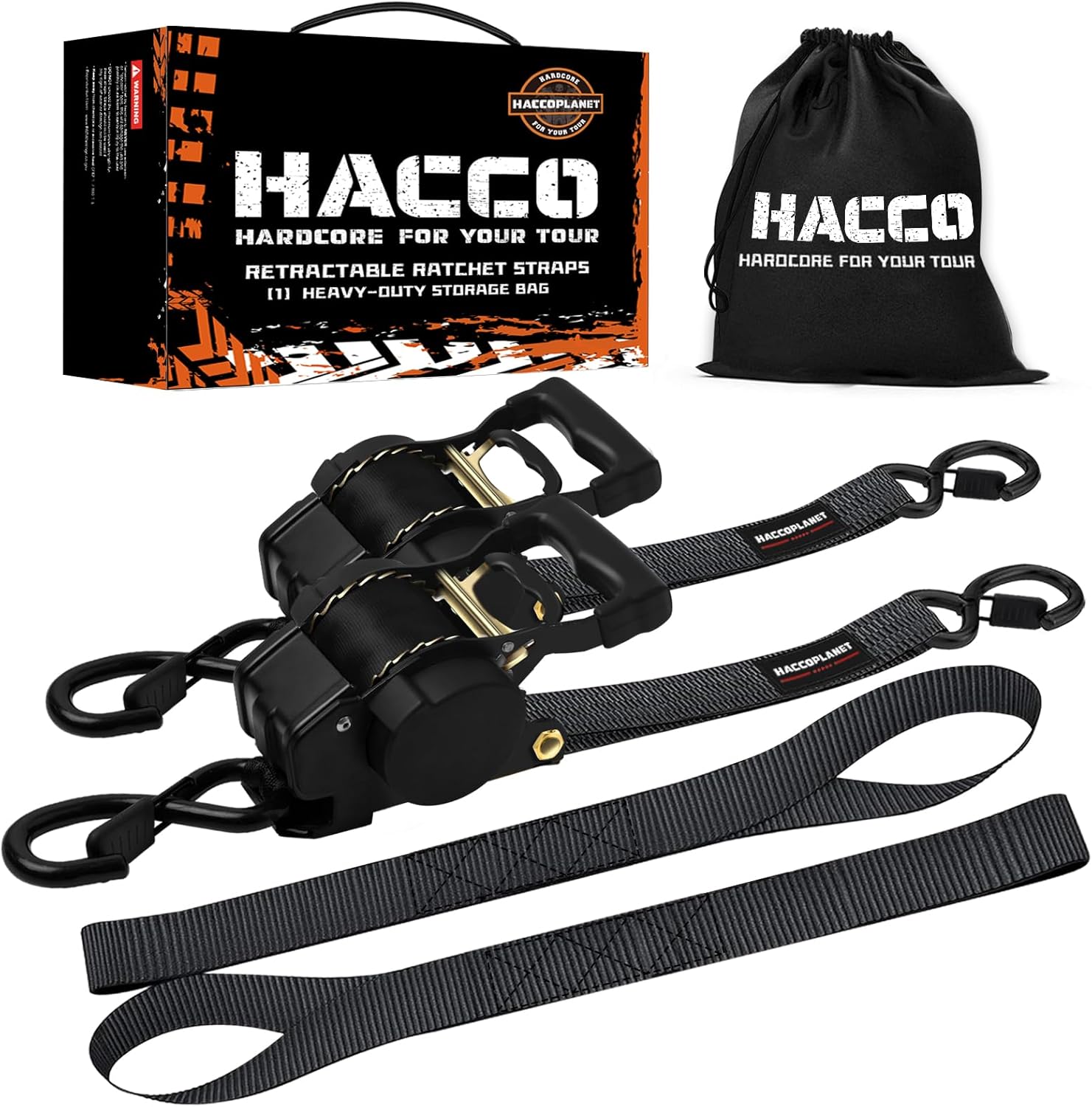 - In The Package & Beyond - 2pcs retractable ratchet straps, 2pcs soft loops, 1pc rainproof carrying bag, 1pc instructions and a EVERLASTING SUPPORT. If you are not pleased with our products, please feel free to contact us. INSURANCE: Your transported cargo or vehicle will also be covered by One MILLION Dollars General Commercial Insurance