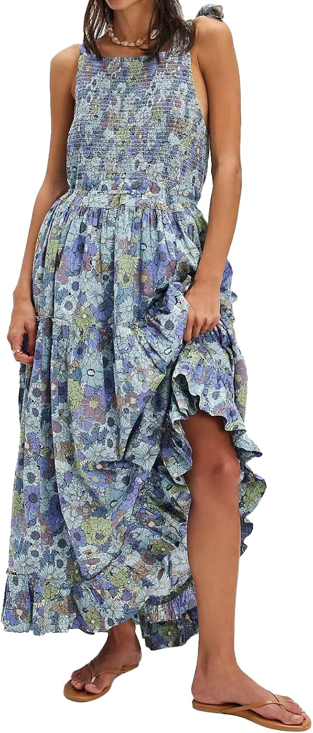 Women Floral Maxi Dress Tie Shoulder Cutout Backless Boho Smocked Flowy Dresses Summer Fall Sundress