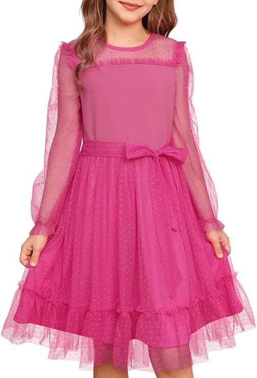 GRACE KARIN Girls Contrast Mesh Dress Formal Party Long Sleeve High Waist Tulle A-Line Fall Dresses for 6-12 Years