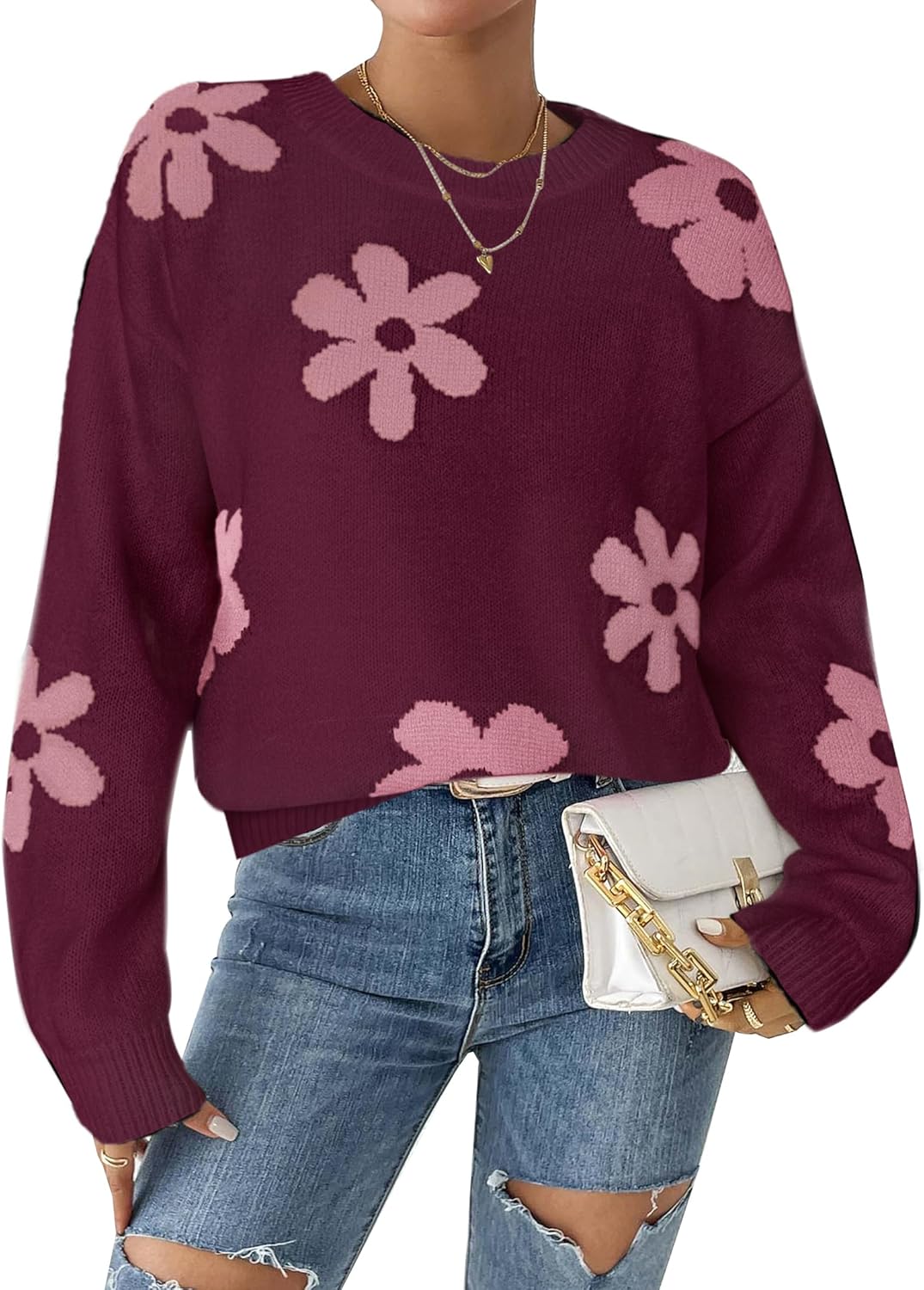 Womens Oversized Cute Flower Sweater Valentine Day 2026 Trendy Vintage Floral Knit Crewneck Pullover Tops