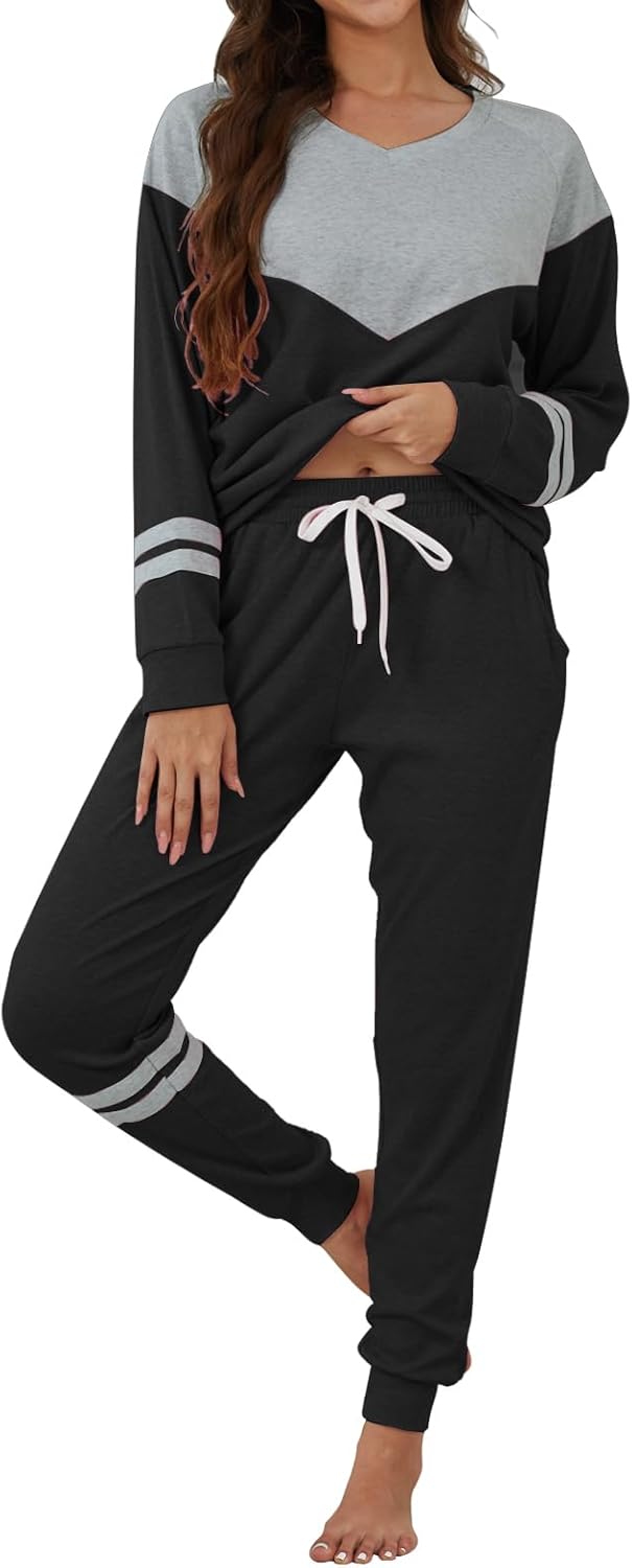 Womens Pajamas Sets Block Color V Neck Long Sleeve Tops with Striped Pullover and Casual Long Pants with Pockets
