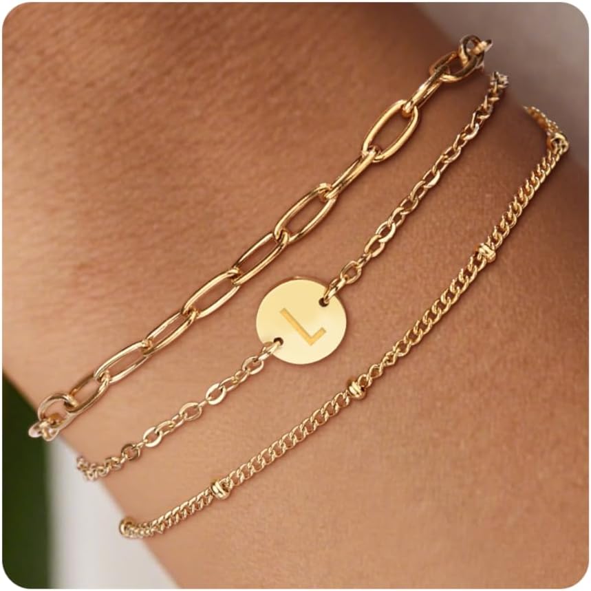 Valentines Day Gifts - Gold Initial Bracelets for Women - 18K Gold Plated over Stainless Steel Letter Charm Bracelet with Layered A to Z Design - Birthday Christmas Jewelry Gifts