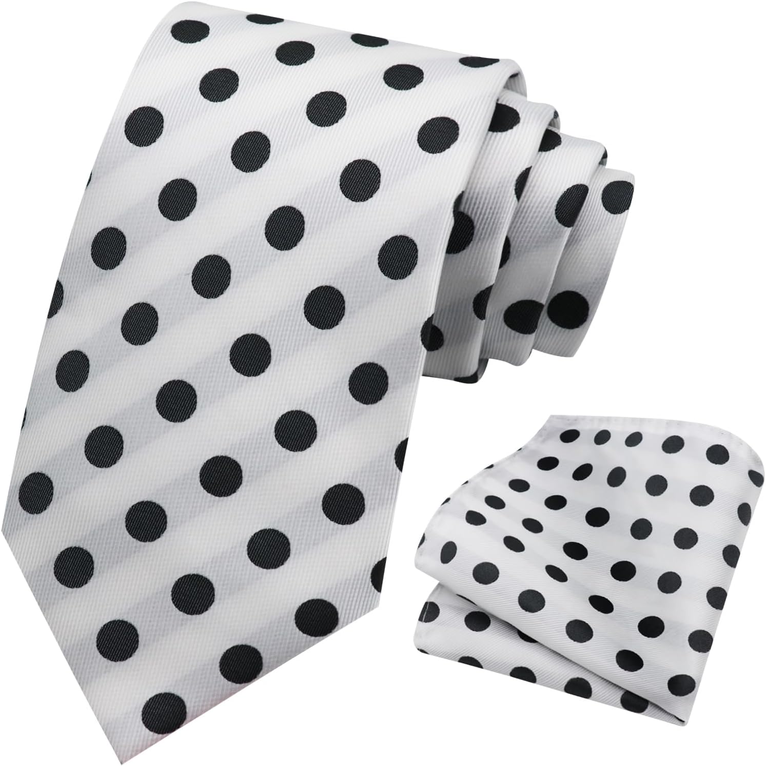 Mens Tie and Pocket Square Combo, Black Blue and White Polka Dot Ties for Men with Handkerchief for Business Tuxedo