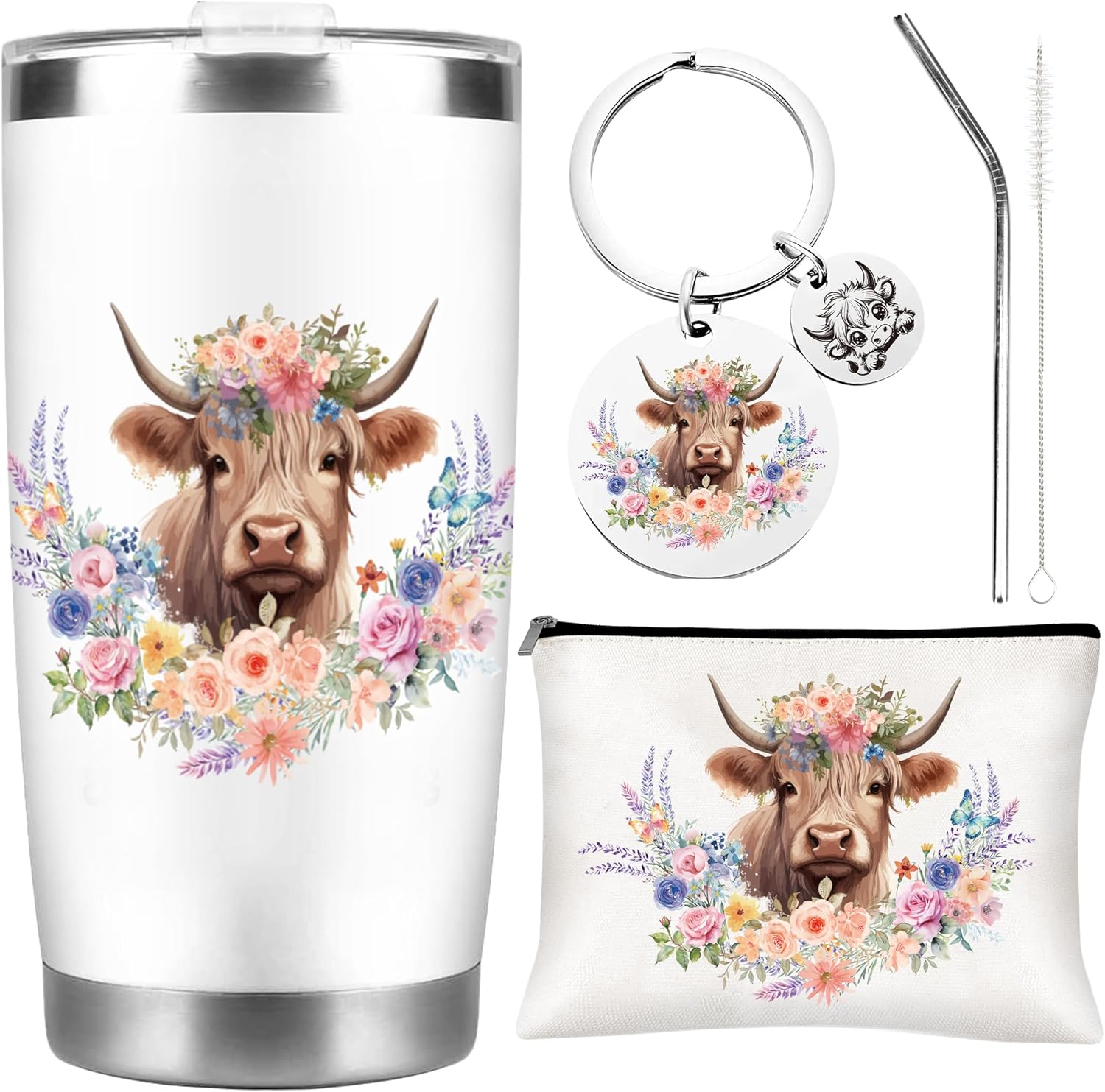 - Complete Highland Cow Gift: This charming package includes one 20oz insulated travel tumbler, one handy cosmetic bag, and one cute keychain, all beautifully presented in a gift box