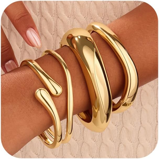 4 PCS Chunky Gold Bangle Bracelets for Women, 14k Gold Plated Big Stackable Bangles Set, Trendy Adjustable Twist Cuff Bracelet Stack Fashion Jewelry Gifts