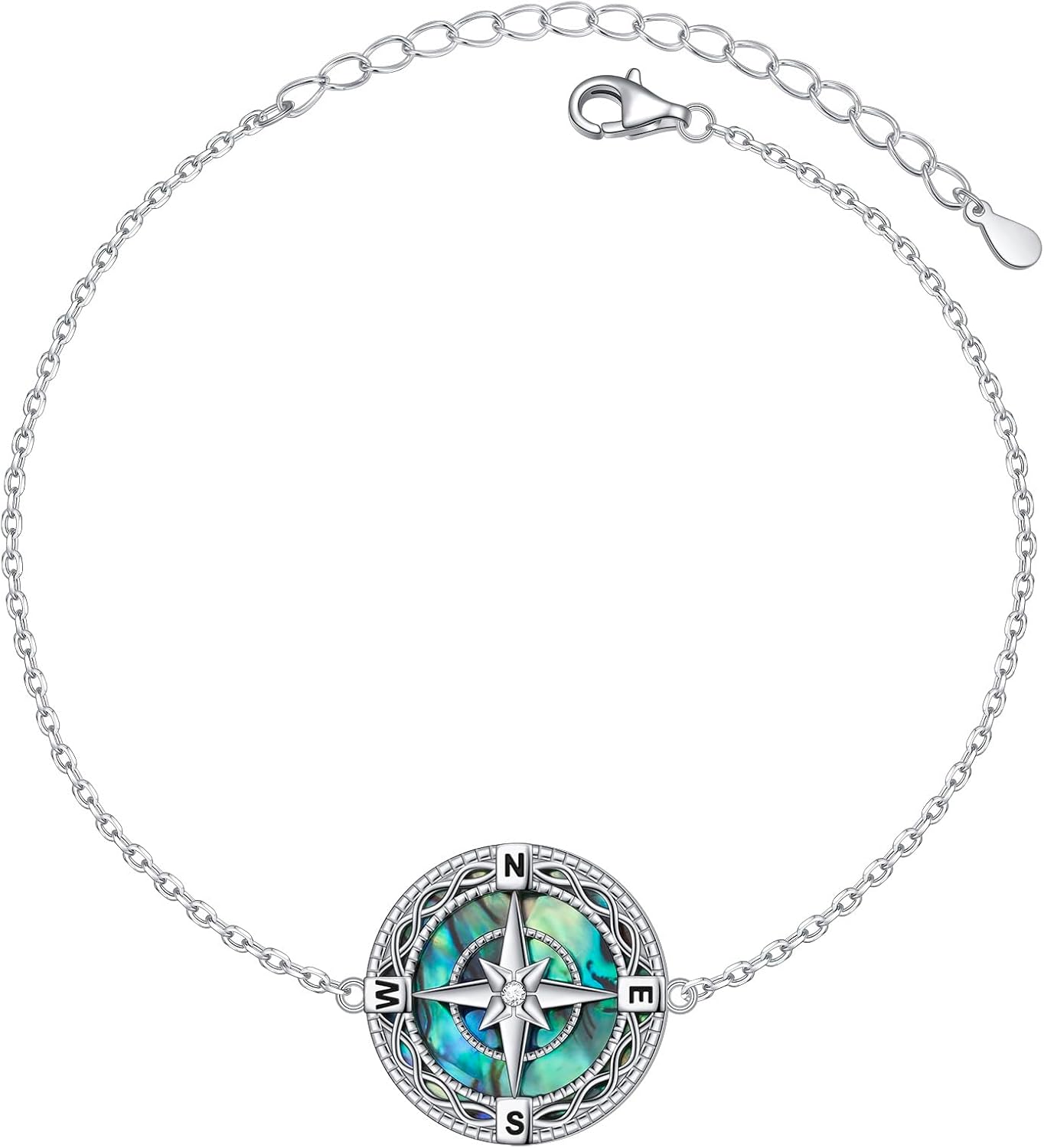 Compass Bracelet for Women Sterling Silver Compass Pendant Bracelet Abalone Shell Travel Jewelry Gift for Graduation