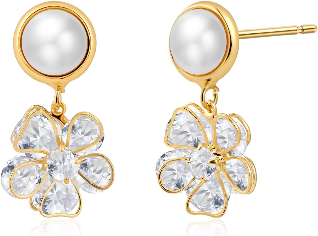 Silver/Gold Pearl Dangle Earrings for Women with Shaped Flower Cubic Zirconia Dangling Crystal Drop Earrings