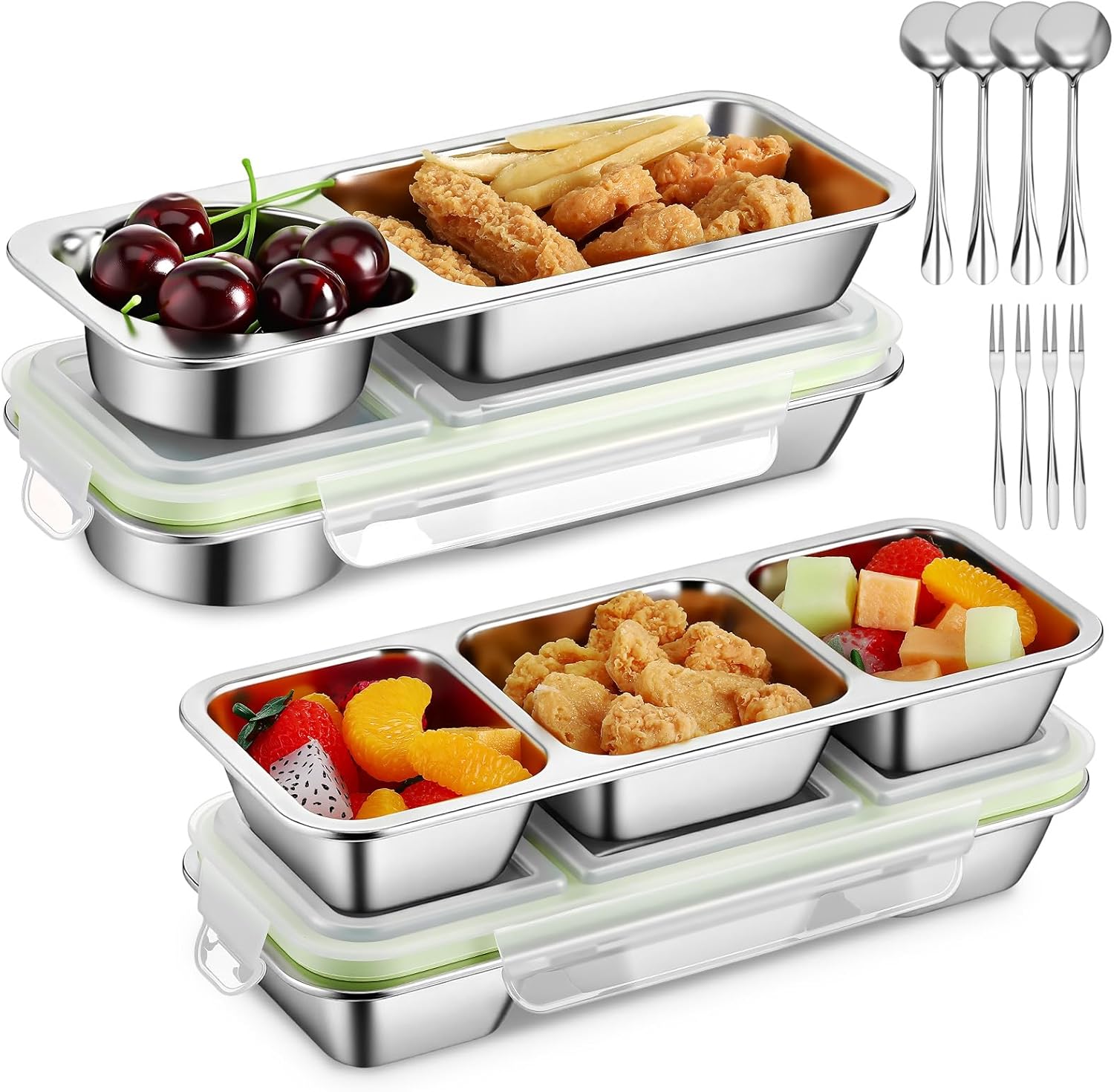 LemonRoad 4 Pack Stainless Steel Snack Containers with Lids Reusable Metal Divided Bento Lunch Boxes with Forks and Spoons Food Storage Containers for Work Travel(Green,2,3 Compartment)