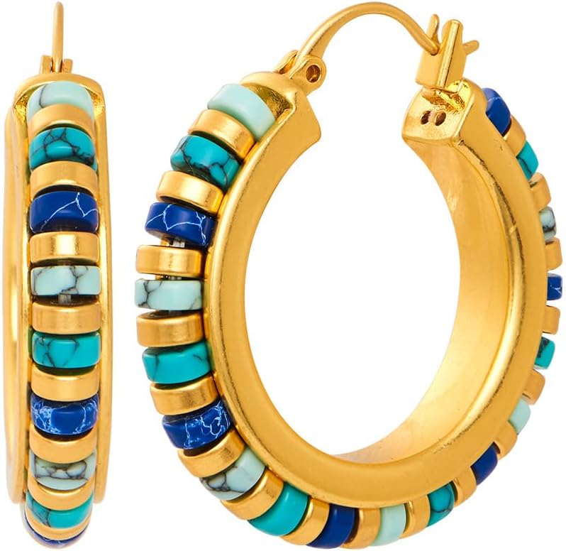 IBARA Vintage Turquoise Hoop Earrings for Women Natural Stone Earrings 18k Gold Plated Medium Hoop Earrings Bohemia Beads Gemstone Earrings Summer Beach Travel Hawaiian Dress Handmade Jewelry