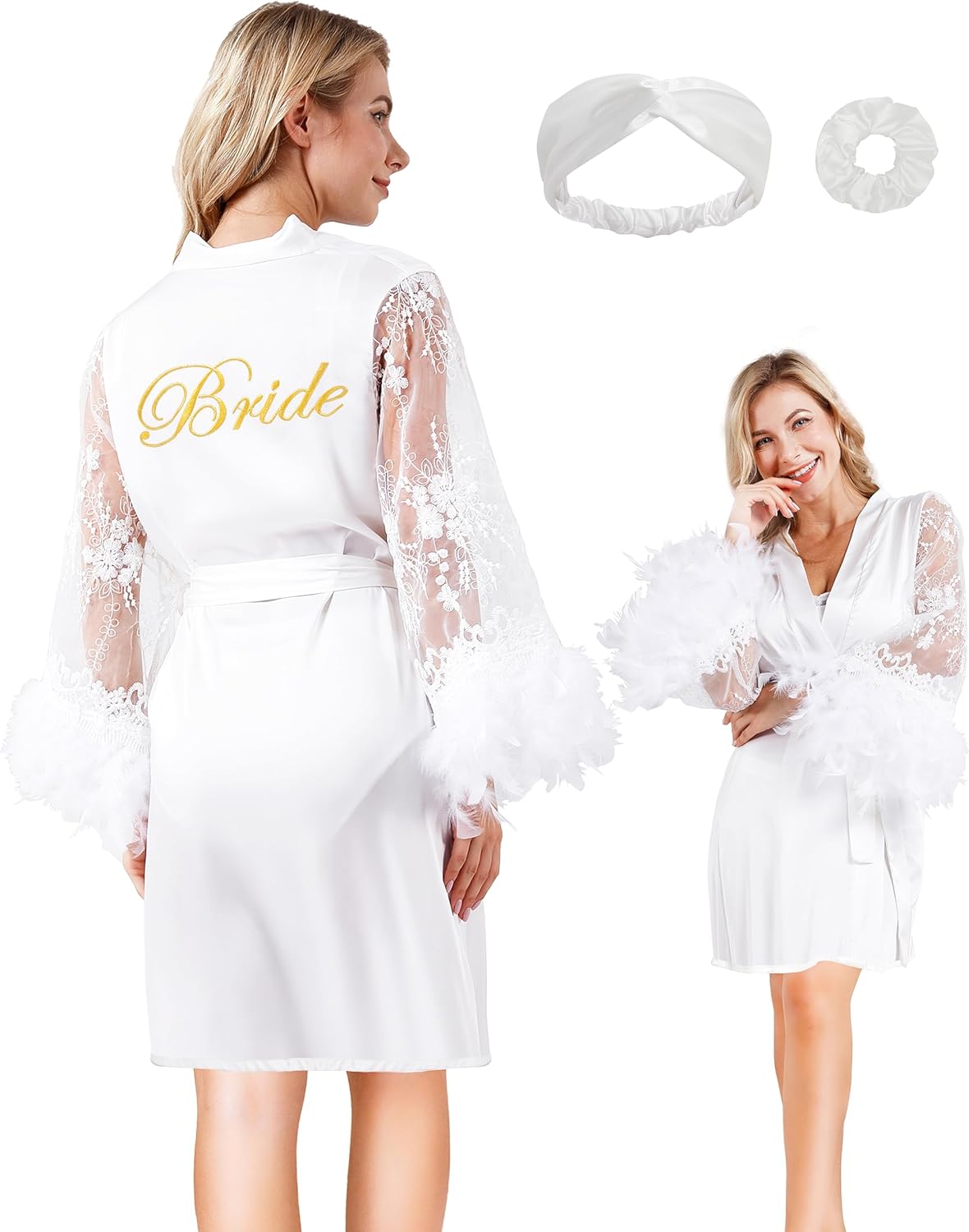 EPLAZA Women Feather Lace Bride Embroidery Robe with Hairband Hair Tie Wedding Bridal Party Satin Kimono Loungewear Sleepwear