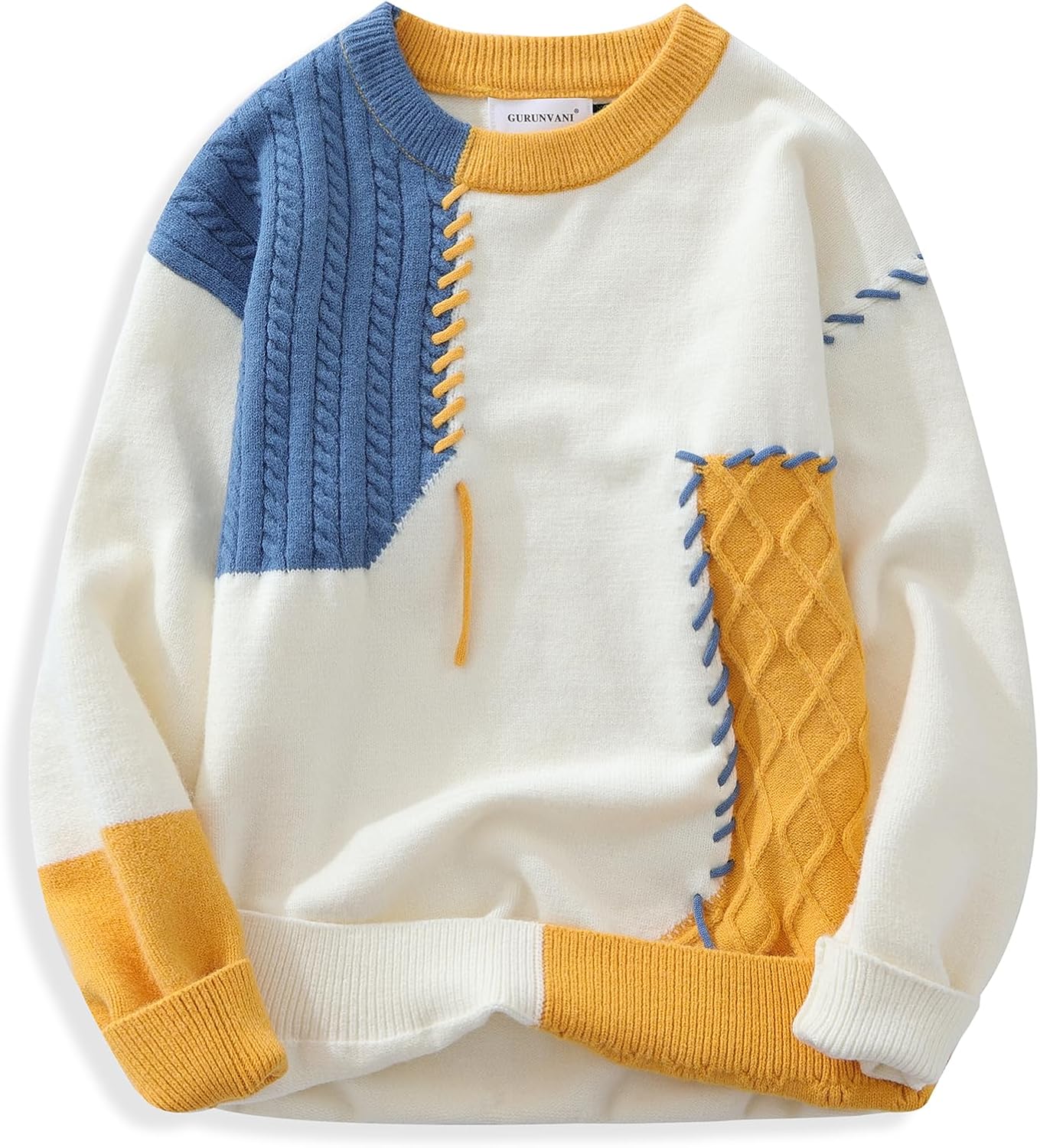 GURUNVANI Patchwork Sweater Mens Colorblock Jumper Cable Knitted Pullover Oversized