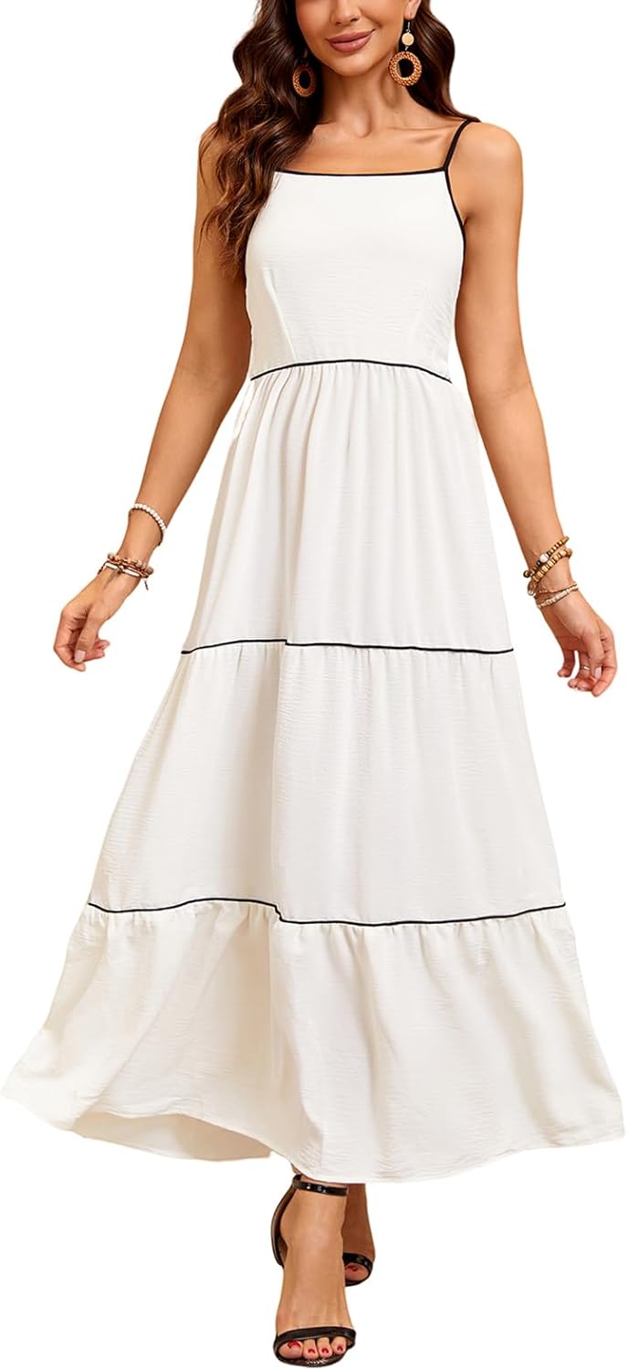 Women's Solid Color Sundress Summer Boho Square Neck Long Dress Spaghetti Strap Back Elastic A line Maxi Dresses
