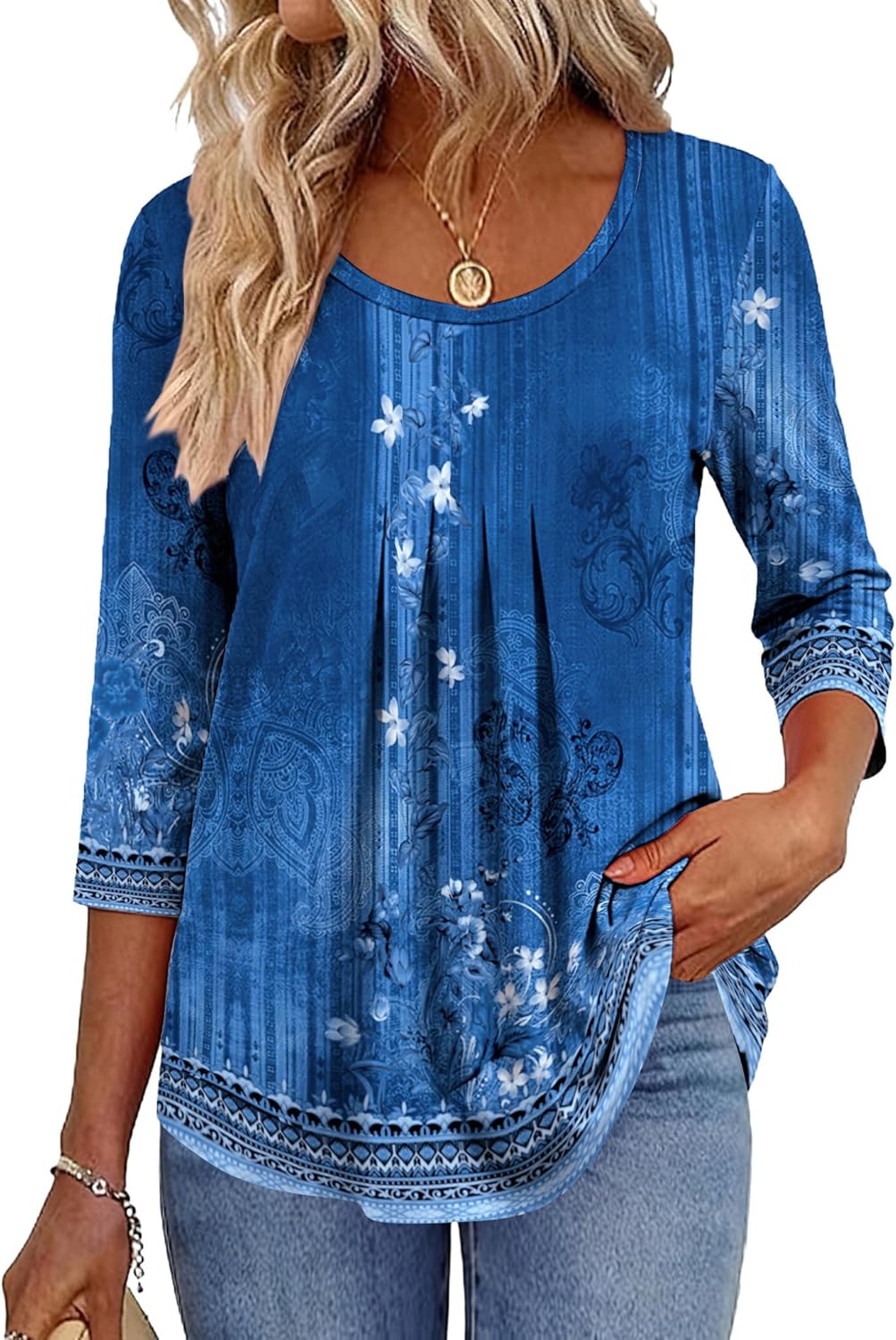 Zeagoo 3/4 Sleeve Tops for Women Crew Neck Blouses Pleated Casual Shirts Fall Work Clothes 2026