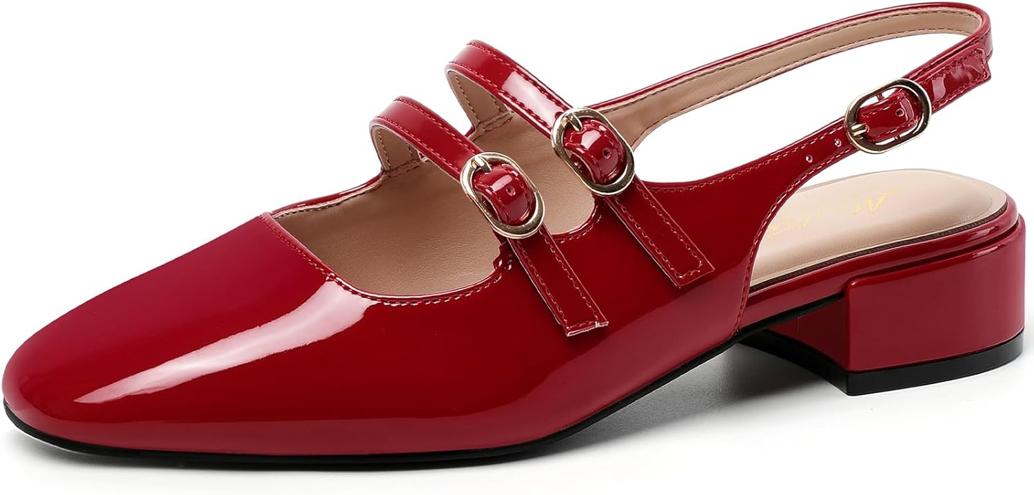 Mostrin Mary Jane Shoes Women Slingback Chunky Low Heels for Women Closed Rounded Toe Ankle Strap Pumps Daily Wedding Party Dress Shoes
