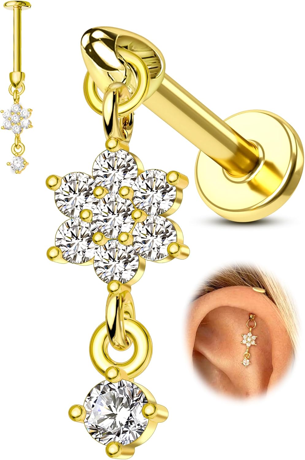 COCHARM 16G Flower Cartilage Earring Vertical Helix Piercing Jewelry, Flat Back Piercing Stud for Cartilage, Dangle Design, Gold and Silver Tone Lobe Helix Earring Stud