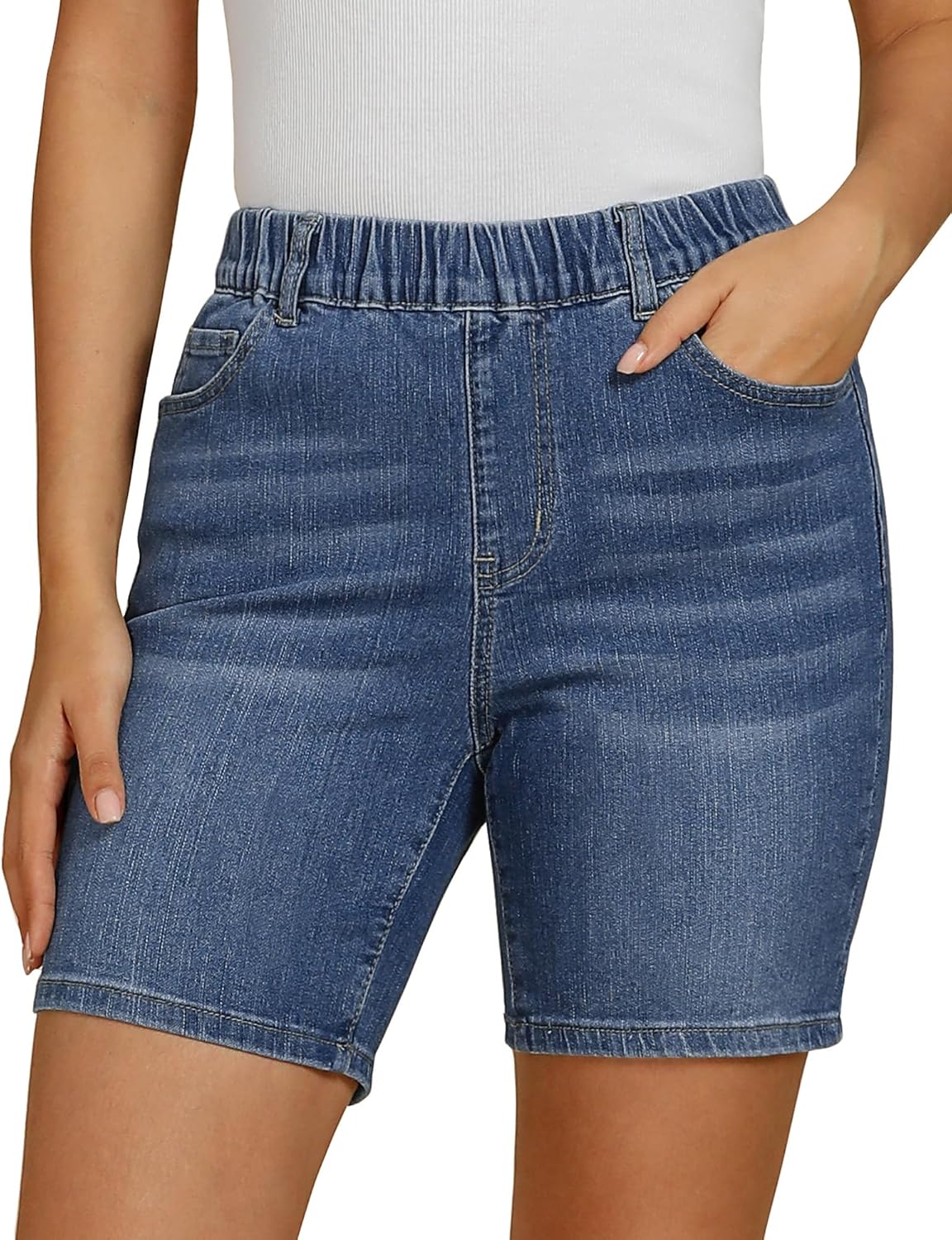 Vetinee Jean Shorts for Women Pull On Elastic Waist Mid Rise Trendy Summer Jorts Stretch Long Denim Shorts 7 Inch Inseam
