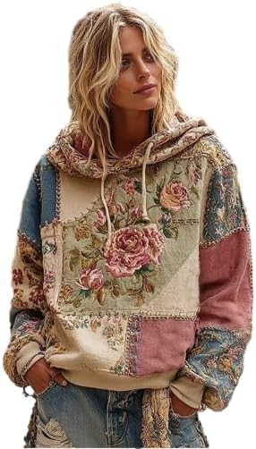 OSCORP women's Boho Floral Hoodie Oversized Patchwork Watercolor Print Casual Hooded Pullover with Pocket for Daily Wear