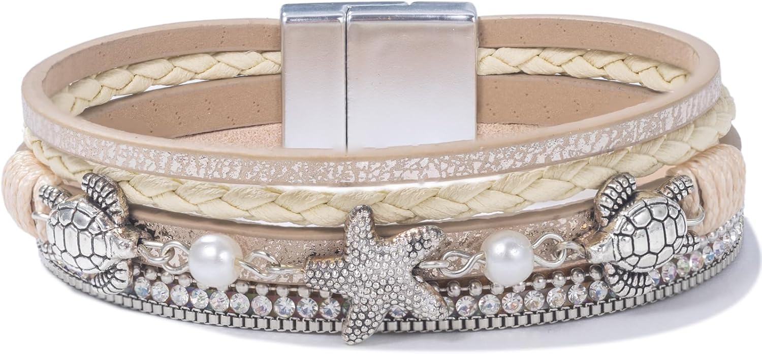 FANCY SHINY Turtle Starfish Leather Wrap Bracelet Boho Rhinestone Pearl Cuff Bracelets for Women Summer Beach Jewelry for Women
