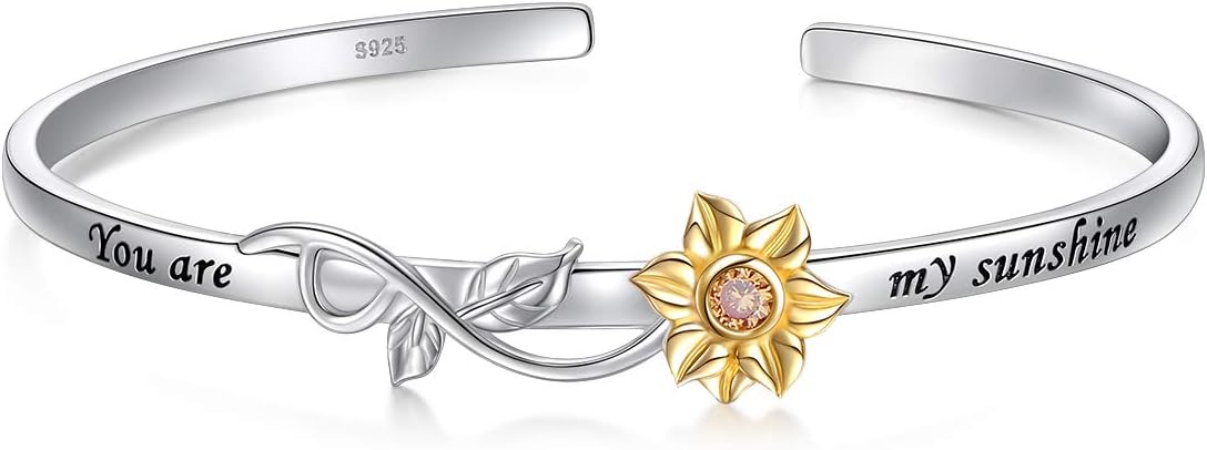S925 Sterling Silver Sunflower with CZ Engraved You Are My Sunshine Bangle for Women 18" (Bangle)