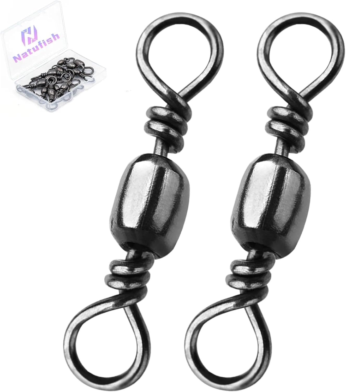 - [Super Smooth Rotation]Natufish Rolling swivel consists of two solid rings and a barrel-shaped part.One ring is connected to the main fishing line,and the other ring is connected to the fishing line or bait.This design not only allows the swivel to rotate 360°at high speed,but also reduces the twisting and entanglement of the fishing line,thereby imitating the action of the bait to replicate the real fish and attract more fish to bite.