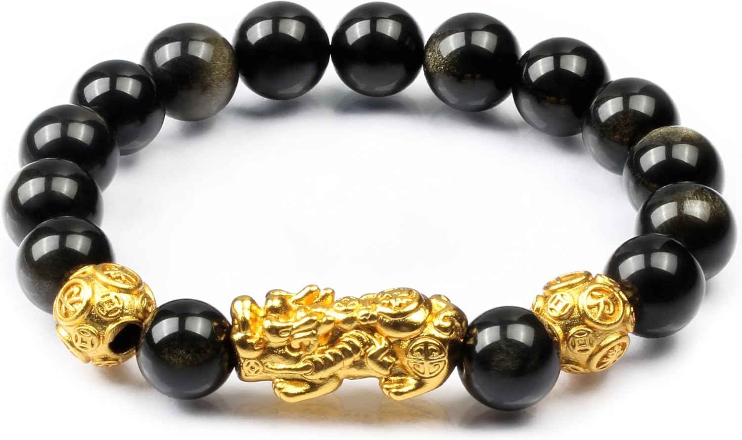 Feng Shui Obsidian bracelet, 24K Gold Plated Pixiu and Six Syllable Mantra of Buddhism brings Fortune and Good Luck, Healing and Protection bracelet, Elastic bracelet for Women and Men
