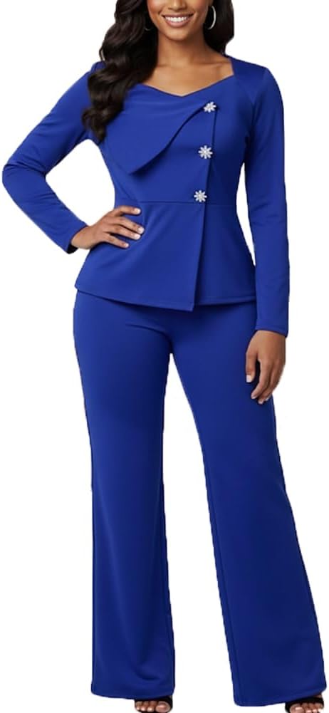 HWP Womens Pant Suit Dressy 2 Piece Business Casual Outfits Long Sleeve Blazer Jacket Wide Leg Pants Set