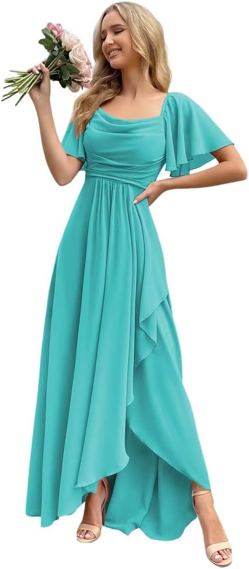 Chiffon A Line Bridesmaid Dresses for Women Flutter Sleeve Long Formal Evening Dress with Slit