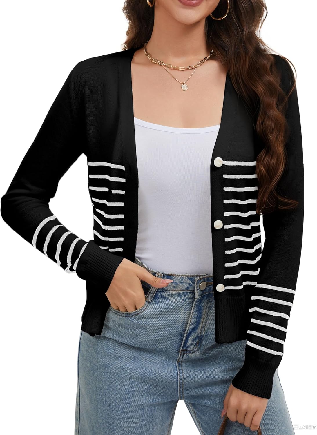 Women Striped Cardigan Sweaters Button Down V Neck Open Front Long Sleeve Knit Sweater Fall Trendy Lightweight Coat