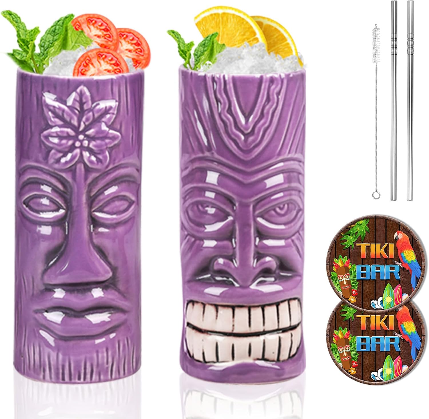 - Accessory Set: Our TIKI Mug Set comes with 2 stainless steel straws, 2 cup mats, and 1 straw brush, giving you everything you need to enjoy your drinks in style.