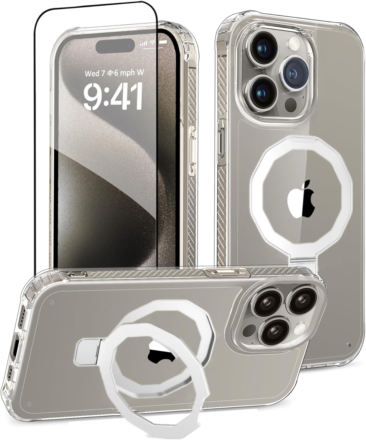 ![for iPhone 15 Pro Max Case, with Screen Protector + Camera Lens Protector, Built-in Seamless Stand, [Compatible with MagSafe] Protective Shockproof Phone Case, Cover iPhone 15 ProMax - Clear - Image 4](https://m.media-amazon.com/images/I/81g2HTl4vzL._AC_SL1500_.jpg)