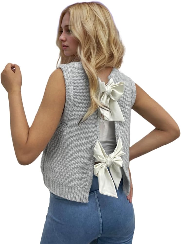 Women's Bow Tie Back Knitted Tank Tops Y2K Casual Sleeveless Vest Top Cute Crewneck Crop Sweater Cardigan Vest