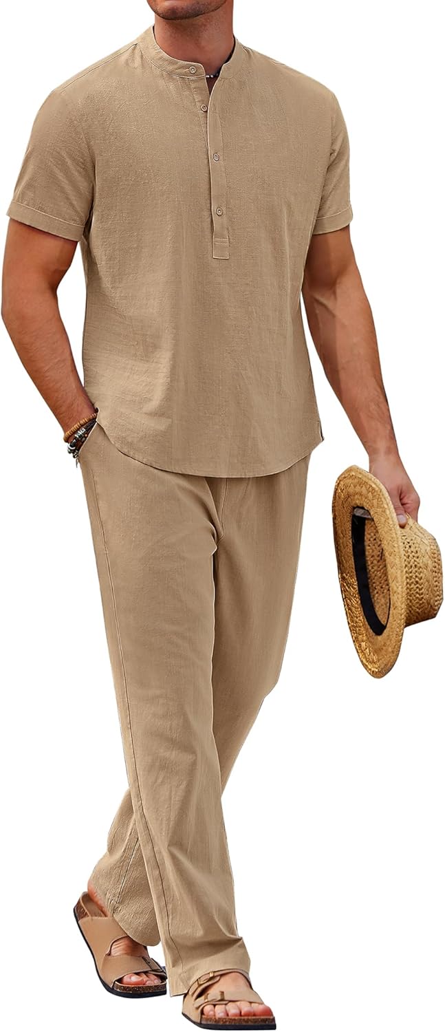 COOFANDY Mens 2 Pieces Cotton Linen Sets Short Sleeve Casual Henley Shirt Summer Beach Pants Lounge Vacation Outfits Set