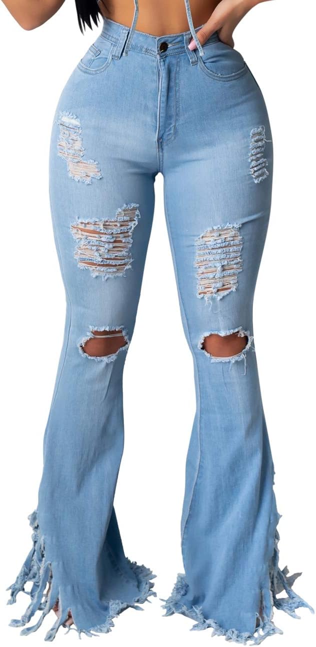 Bell Bottom Jeans for Women Ripped Hole High Waisted Classic Flared Wide Leg Denim Pants