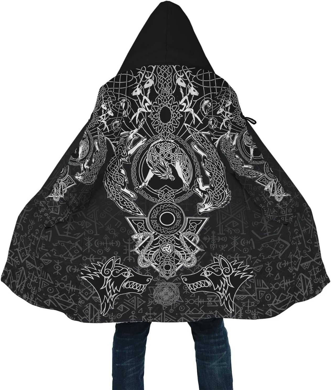 Fenrir Wolf Hooded Cloak, Viking 3D Tattoo Street Style, Thick Winter Cape, Oversized Cosplay Jacket for Urban Wear