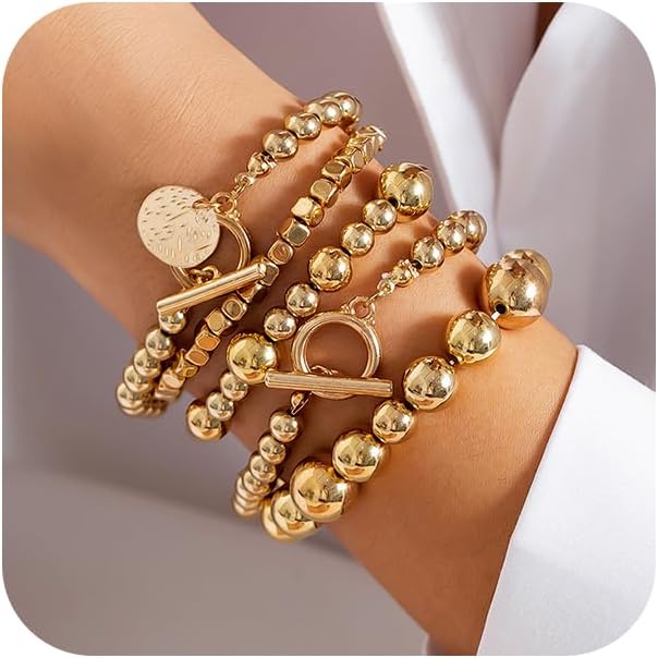 5Pcs Stack Gold Beaded Stretch Bracelets Set for Women Vintage Stackable OT Buckle Bangles Coin Disc Statement Bracelet Trendy Elastic Jewelry Gifts